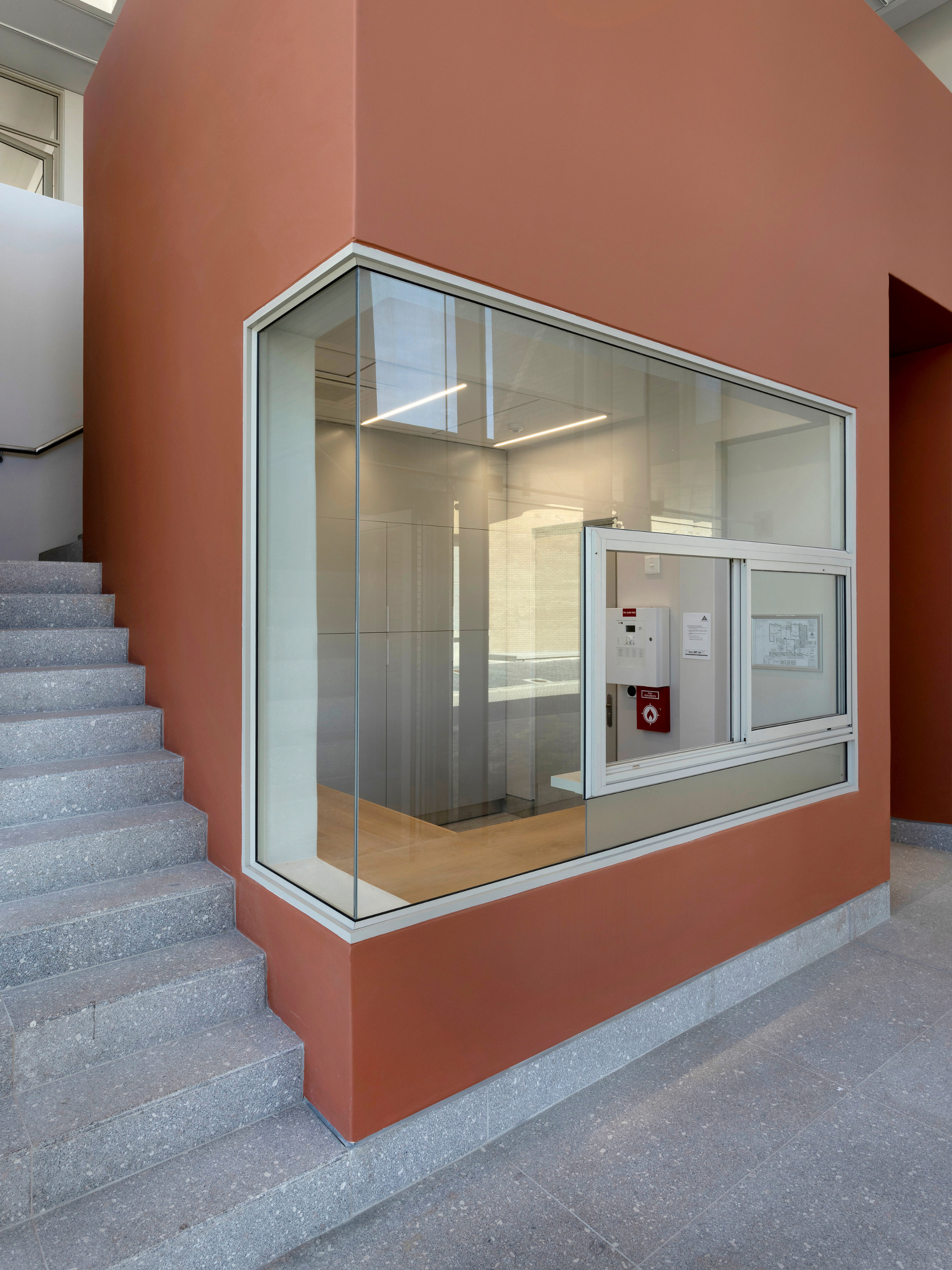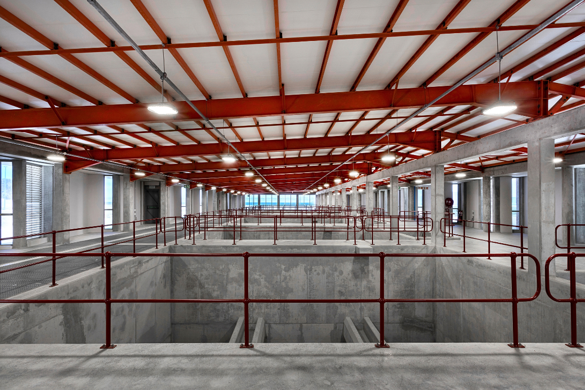 At the top of the site, a two-storey administration component is integrated into the topmost filtering building. This includes offices, meeting spaces and staff facilities. There are elements such as a glazed atrium and rhythmic brick brise-soleil.