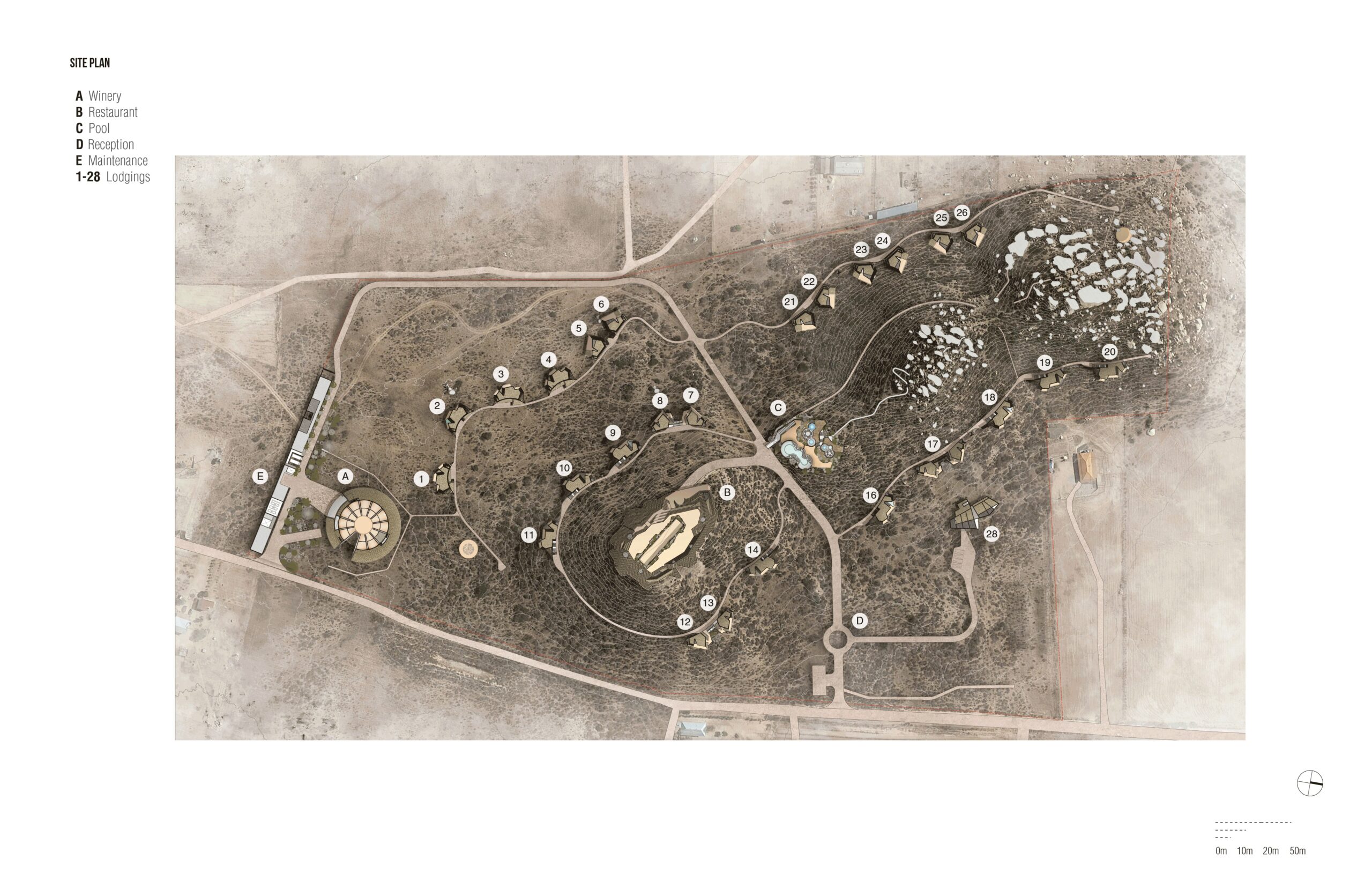 The 1,963-square-meter winery deploys a 25-meter radius circular winery design. This central arrangement organizes the entire production cycle—fermentation, bottling, barrel storage, and tasting rooms—around a central courtyard, removing unnecessary circulation.